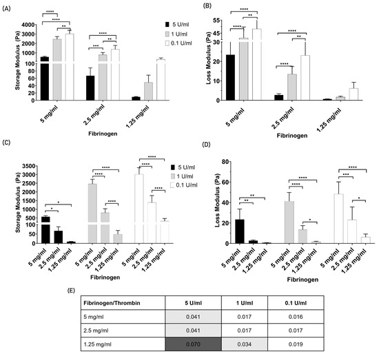 Fibrin gel rheological characterization. (A) Storage (G′) and (B) Loss modulus (G″) of fibrin gel in Pascal (Pa). The data are grouped by the fibrinogen concentration. (C) Storage (G′) and (D) Loss modulus (G″) of fibrin gel in Pascal (Pa). The data are grouped by the thrombin concentration. (E) The table below shows the loss tangent values. The color scheme highlights values in the same range. The fibrinogen concentrations tested were 5, 2.5, and 1.25 mg/mL, and for thrombin, they were 5, 1, and 0.1 U/mL. The error bars correspond to the Standard Deviation. The data are between n = 3 and 6. The significance values were taken when p < 0.05, graphically denoted as * p < 0.05, ** p < 0.01, *** p < 0.001 and **** p < 0.0001.