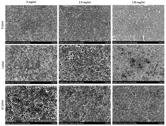 Scanning electron microscope images of fibrin gel polymerized with 5, 2.5, and 1.25 mg/mL of fibrinogen and 5, 1, and 0.1 U/mL of thrombin. The scale bar represents 5 µm, except for condition 1.25 mg/mL with 0.1 U/mL, which represents 4 µm. n = 3.