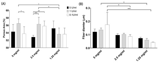 Fibrin gel porosity and fiber diameter. (A) Percentage of the area corresponding to pores in the fibrin gel in function of fibrinogen and thrombin concentration (n = 6 to 9). (B) Fiber diameter in micrometers (µm) in function of fibrinogen and thrombin concentration (n = 3). The significance values were taken when p < 0.05, graphically denoted as * p < 0.05, ** p < 0.01, and *** p < 0.001. The error bars represent the Standard Deviation.