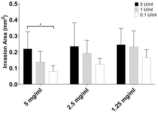 Endothelial cell migration area in function of the fibrinogen and thrombin polymerization conditions. The asterisk symbol in the plot represents * p < 0.05. The error bars represent the Standard Deviation. n = 5.