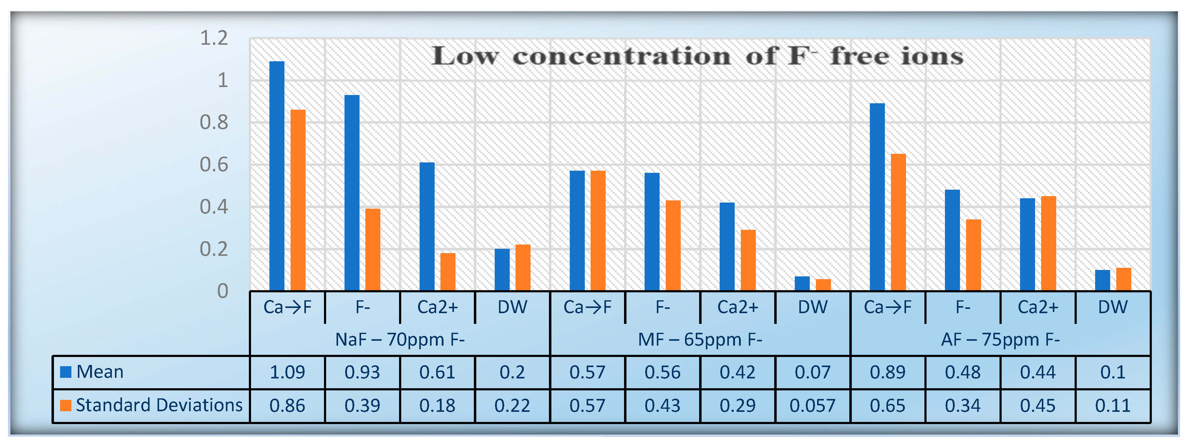 - Pessan, J.; Alves, K.; Ramires, I.; Taga, M.; Sampaio, F.; Whitford, G.; Buzalaf, M. Effects of Regular and Low-fluoride Dentifrices on Plaque Fluoride. J. Dent. Res. 2010, 89, 1106–1110. [Google Scholar] [CrossRef]