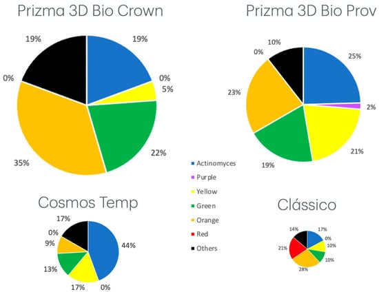 The analysis of the proportion of complexes among control and tested groups showed statistically significant differences in the Yellow, Orange, and Red complexes and Actinomyces (Table 4). Also, the highest total bacteria count was for Prizma 3D Bio Crown, which statistically differed from Clássico. The same result was observed for the total bacterial species count (Table 4).