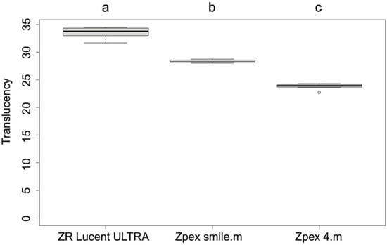 The data were normally distributed based on the Shapiro–Wilk test. One-way ANOVA followed by a Tukey post hoc test revealed that the TP of ZR Lucent ULTRA was statistically the highest (33.5 ± 1.1). The TP of Zpex Smile.m (28.4 ± 0.3) was higher than that of Zpex 4. m (23.8 ± 0.5). Thus, higher yttria content resulted in a higher translucency. These results are shown in Figure 1.