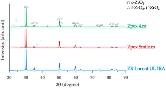 Representative XRD patterns are shown in Figure 2. The three highly translucent YSZ samples exhibited two peaks corresponding to the tetragonal phase (t-ZrO2 and t’-ZrO2). The relative amounts of each phase in YSZ, as determined by a Rietveld analysis, are summarized in Table 2. The ZR Lucent ULTRA contained a higher proportion of c-ZrO2 than the Zpex Smile.m. By contrast, Zpex 4.m contained a lower proportion of c-ZrO2 than Zpex Smile.m. The higher the yttria content in YSZ, the greater the proportion of t’-ZrO2 and c-ZrO2 phases.