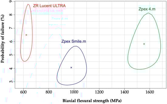 The Weibull analysis results are listed in Table 3. The Weibull distribution and its contour plots for the biaxial flexural strength are shown in Figure 3 and Figure 4, respectively. Weibull analysis revealed that Zpex 4. m exhibited a significantly higher flexural strength than Zpex Smile.m. The ZR Lucent ULTRA had a significantly lower characteristic strength among the three highly translucent zirconia samples investigated.