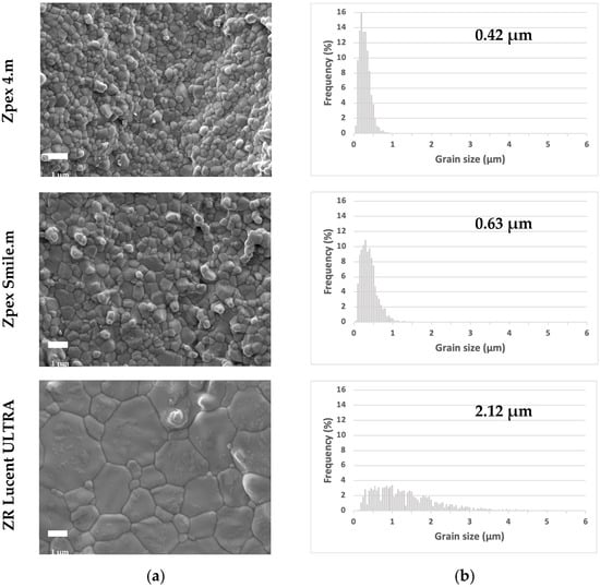Microstructural analysis using the linear intercept method revealed that the average grain sizes of the ZR Lucent ULTRA, Zpex Smile.m, and Zpex 4. m were 2.12 ± 0.27, 0.63 ± 0.07, and 0.42 ± 0.04, respectively. Using the same method, Liu et al. described the average grain sizes of KATANA Zirconia UTML (6YSZ), KATANA Zirconia STML (5YSZ), KATANA HT (4YSZ), Zpex Smile (5YSZ), and Zpex 4 (4YSZ) as being 2.10 ± 0.38, 1.47 ± 0.23, 0.56 ± 0.06, 0.91 ± 0.09, and 0.67 ± 0.07 [26]. A higher yttria content increased the average grain size in the current study as well as in their results. Regarding the grain size distribution of 5YSZ, KATANA Zirconia STML had a higher proportion of large grains than Zpex Smile and Zpex Smile.m, potentially owing to differences in the sintering temperature. KATANA Zirconia STML was sintered at 1550 °C, whereas Zpex Smile and Zpex Smile.m were sintered at 1450 °C and 1450–1500 °C, respectively. Inokoshi et al. reported that higher sintering temperatures increase the ZrO2 grain size [33].