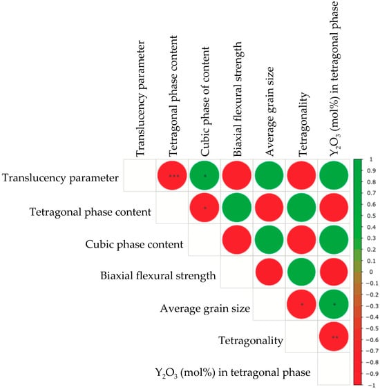 A summary of the correlation analysis is presented in Figure 6. The TP was positively correlated with the cubic phase content, average grain size, and Y2O3 (mol%) in the tetragonal phase. The tetragonal phase content was positively correlated with the biaxial flexural strength and tetragonality. The cubic phase content was positively correlated with the average grain size and Y2O3 content (mol%) in the tetragonal phase. The biaxial flexural strength was positively correlated with tetragonality. The average grain size is positively correlated with Y2O3 (mol%) in the tetragonal phase. However, the TP was negatively correlated with the tetragonal phase content, biaxial flexural strength, and tetragonality. The tetragonal phase content was negatively correlated with the cubic phase content, average grain size, and Y2O3 content (mol%) in the tetragonal phase. The cubic phase content was negatively correlated with the biaxial flexural strength and tetragonality. The biaxial flexural strength was negatively correlated with the average grain size and Y2O3 content (mol%) in the tetragonal phase. The average grain size was negatively correlated with tetragonality. The tetragonality was negatively correlated with Y2O3 (mol%) in the tetragonal phase.