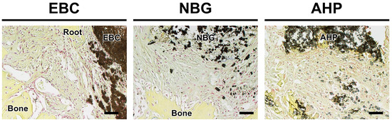The present study also investigated the compositional changes of the extruded EBC and NBG. Previous research has shown that EBC and NBG attract Ca and P ions in artificial body fluids, leading to the production of hydroxyapatite on the surface [12,24]. Moreover, our previous studies demonstrated that EBC formed hydroxyapatite on the surface when implanted in the subcutaneous tissue of rats, while NBG formed a silicon-depleted area within the material [63,64]. However, the present study is the first report on the chemical behavior of EBC and NBG in periapical tissues.