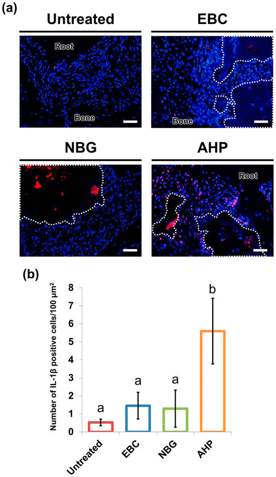 Immunoreactivity of interleukin-1 beta (IL-1β) in the periapical tissues 28 days after the extrusion of EndoSequence BC Sealer (EBC), Nishika Canal Sealer BG (NBG), and AH Plus (AHP). (a) Representative images of immunofluorescence staining for IL-1β in untreated teeth and teeth with sealer extrusion. The extruded sealers are outlined using white dotted lines. Red: IL-1β. Blue: DAPI (nuclear stain). Scale: 50 μm. (b) Density of IL-1β-positive cells in the periapical tissues. Data are presented as means ± standard deviation. Different letters indicate statistically significant differences (Tukey’s test, n = 6, p < 0.05).