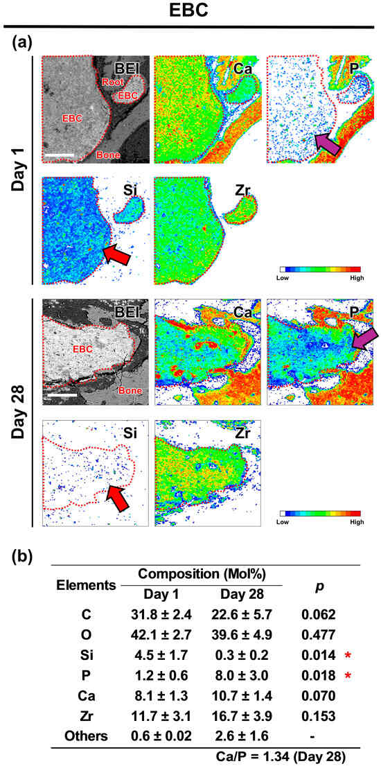 Changes in the elemental composition of EndoSequence BC Sealer (EBC) in periapical tissues. (a) Backscattered electron images and elemental mapping images showing the distribution of calcium (Ca), phosphorus (P), silicon (Si), and zirconium (Zr) in the periapical area. EBC is outlined using red dotted lines. On Day 1, moderate intensity Si signals were observed in the extruded EBC, whereas Si signals were hardly detected on Day 28 (red arrows). P signals were scarce in the extruded EBC on Day 1 but showed moderate intensity on Day 28 (purple arrows). Scale: 150 μm. (b) Elemental composition of the extruded EBC. Asterisks indicate significant differences in elemental composition between Days 1 and 28 (unpaired t-test with p < 0.05 indicating statistical significance).