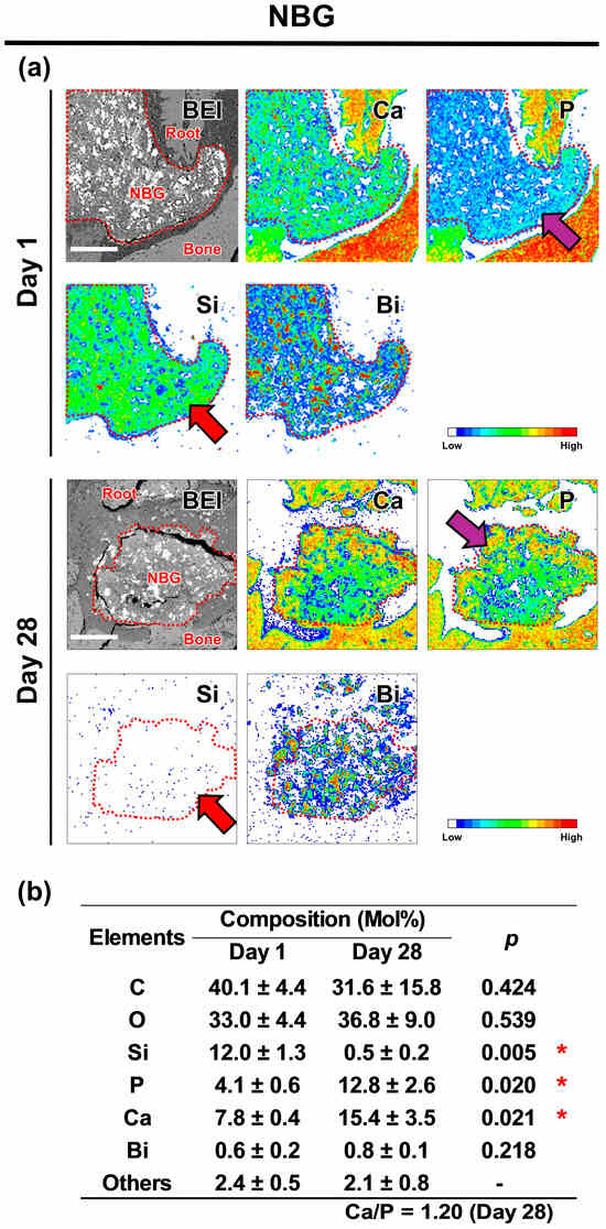 The elemental mapping images taken on postoperative Day 1 revealed that the extruded EBC contained Ca, Si, and Zr but only a minimal amount of P (Figure 5), whereas the extruded NBG contained Ca, P, Si, and Bi (Figure 6). By postoperative Day 28, the elemental composition of the extruded EBC and NBG had shifted, now containing Ca, P, and Zr or Bi, with only trace amounts of Si (Figure 5 and Figure 6). The elemental composition analysis indicated that the extruded EBC had a significantly higher P concentration and a significantly lower Si concentration on postoperative Day 28 than on Day 1 (Figure 5), while the extruded NBG had significantly higher concentrations of Ca and P but a significantly lower Si concentration on postoperative Day 28 than on Day 1 (Figure 6).