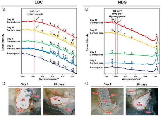 The Raman bands corresponding to zirconium oxide [24], tricalcium silicate [24], and bismuth subcarbonate [25] were identified in the spectra of the as-prepared EBC and NBG. The extruded EBC and NBG in the specimens collected on postoperative Day 1 exhibited only Raman bands attributed to the original components of the sealers and the embedding MMA resin [26] (Figure 7). However, the extruded EBC and NBG in the specimens collected on postoperative Day 28 displayed Raman bands attributed to hydroxyapatite at 960 and 1002 cm−1 [27], in addition to Raman bands attributed to their original components and the embedding resin [26] (Figure 7).