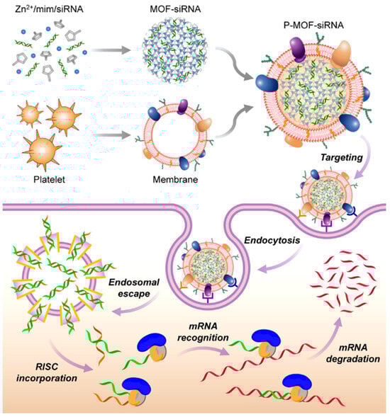 Platelet membrane-coated siRNA-loaded MOFs (P-MOF-siRNA) for gene silencing, reprinted from Ref. [94].
