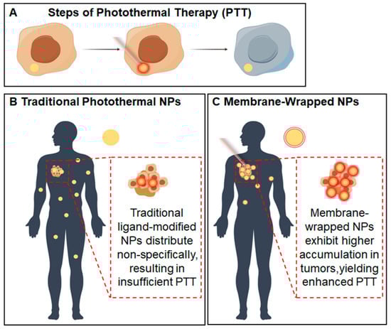 (A): Steps of photothermal therapy. (B,C): The gap between traditional photothermal NPs and membrane-wrapped NPs, adapted with permission form Ref. [97].