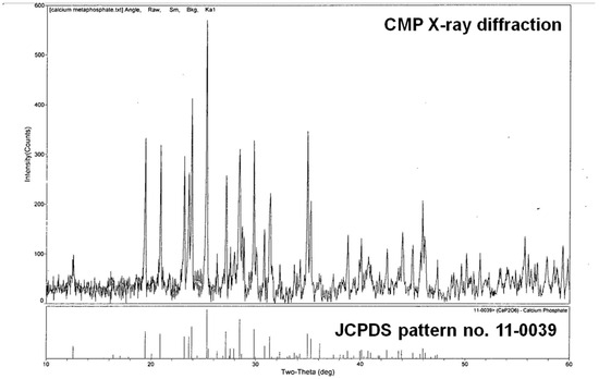 The XRD diffraction pattern of the CMP showed sharp diffraction-characteristic peaks that appeared at around 25.28°, 28.50°, and 31.76° (Figure 1). This corresponds to the characteristic peaks of crystalline β-meta calcium phosphate as published earlier [24,25] and by the Joint Committee on Powder Diffraction Standards (JCPDS no. 11-0039).