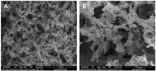 SEM micrographs of porous CMP scaffold: (A) ×100 and (B) ×1000 viewed under low vacuum at 10.0 kV.