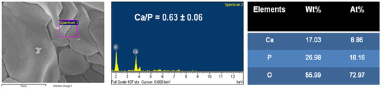 The topography of the CMP was observed by SEM (Figure 3A,B) to possess a predominant porosity over a wide range of pore sizes from 80 to 100 µm. In addition, microporosity pores (>400 µm) were also observed across the surface of the scaffold. EDX microanalysis results showed porous CMP with a Ca/P ratio of 0.48 ± 0.046 (n = 4) (Figure 4).