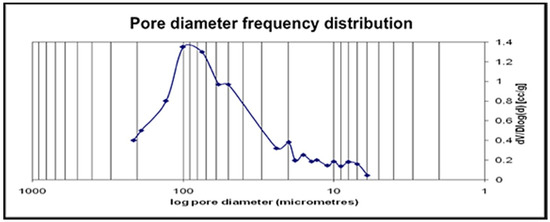 The proportion of the number of atoms corresponded to the chemical composition of β-calcium metaphosphate (CaP2O6). The pore diameter frequency distribution and % porosity data were collected via MIP. Pores were within the 0–217 µm range studied, and 100 µm pores were the most frequent within the structure of CMP (Figure 5), although smaller and larger pores were also detected.