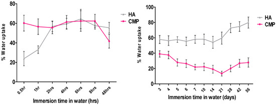 Graph showing % water uptake of HA and CMP at 37 °C cover period of 56 days (time(x) axis not to scale, error bar = SD).