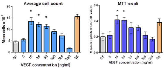 The dose-dependent effect of varying VEGF concentrations on HUVEC proliferation; grey columns represent EC media supplement-free (SF) and brown columns represent EC media with supplements (SE). Data presented as mean ± standard deviation (SD) from quadruplicates and three independent experiments. One-way analysis of variance (ANOVA) was used to compare the means among groups; * p < 0.05 was considered statistically significant.