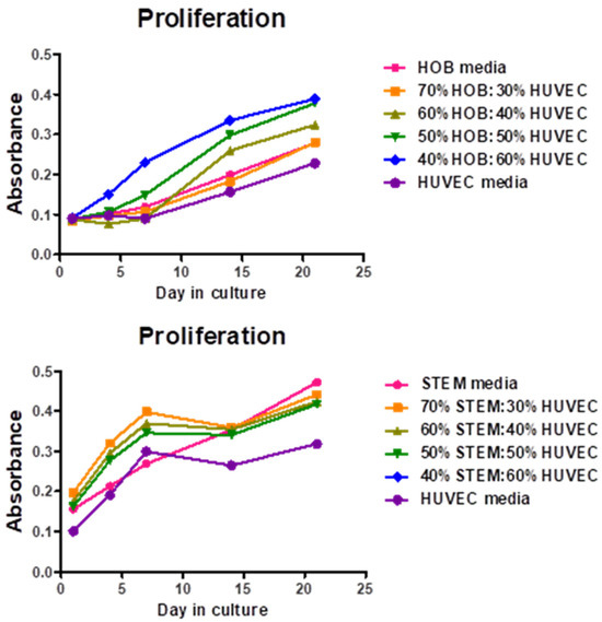 To determine the ideal medium for the maximum proliferation of cells within the co-culture system, different ratios were investigated. Over 21 days, an increasing trend was observed universally. The ratio of 60% HUVEC: 40% HOB media was optimum for HUVEC/HOB co-culture and 30% HUVEC: 70% MSC for HUVEC/hBMSC co-culture (Figure 8).