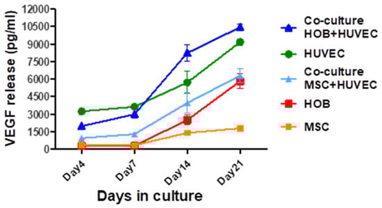 The highest VEGF release was observed in the co-culture of aHOB/HUVEC up to 10,455.6 pg/mL on day 21 followed by HUVEC monoculture. In contrast, very low levels of VEGF were released by hBMSC in monoculture. Both the co-culture of aHOB/HUVEC and hBMSC/HUVEC released more VEGF than the monoculture of aHOB or hBMSC alone (Figure 10).