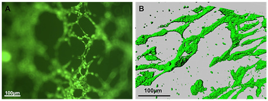 Each EC marker showed the organization of cells forming capillary-like structures inside the porous CMP. This was further confirmed by capturing images at different depths of the scaffold (Supplementary Materials). This animation confirmed that cells were able to infiltrate the interconnecting pores of the scaffold and arrange themselves in an orderly manner to form tubule-like structures.
