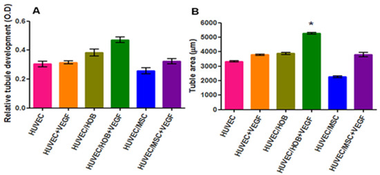 Comparison of the relative amount of tubular formation in different culture systems using (A) CD31 ELISA and (B) image analysis software. Data presented as mean ± standard deviation (SD) from quadruplicates obtained from triple-repeated experiments. One-way analysis of variance (ANOVA) indicated a significant difference among the culture groups (p < 0.01). Tukey’s post hoc test showed that the mean values of the co-cultures of HUVEC/aHOB + VEGF were statistically significantly higher than co-cultures of HUVEC/hBMSCs (* p < 0.01).