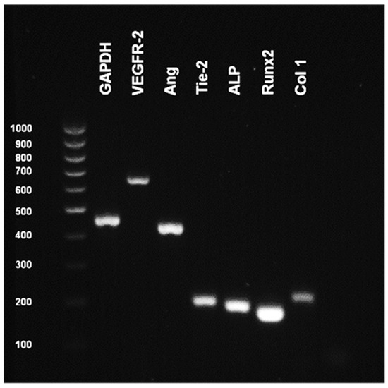 Reverse-transcriptase polymerase chain reaction (RT-PCR) for endothelial and osteoblast marker expression from selected co-culture conditions (HUVEC/aHOB+VEGF) after 14 days. Endothelial cell markers (VEGFR-2, Angiopoietin-1, Tie-2) and osteoblast markers (ALP, Runx2, col1) observed in cell lysates of co-culture confirmed the phenotypic expression of endothelial cells.