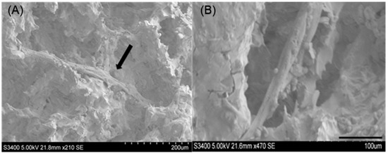 (A) The SEM image shows the tube-like structure across the surface of CMP (arrow). (B) A tubular structure inside the calcium metaphosphate (CMP) scaffold.