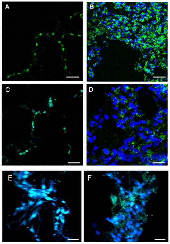 Immunofluorescent staining of EC with CD31 (Figure 16A,B), vWF (Figure 16C,D), and actin and vimentin (Figure 16E,F) demonstrated the organization of cells forming capillary-like structures inside the porous CMP scaffold.