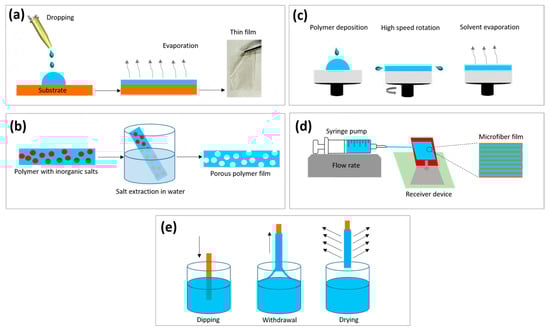 Schematic representation of the methods used for film preparation: (a) solvent casting; (b) salt leaching; (c) spin coating; (d) microfluidic spinning; (e) dip coating.
