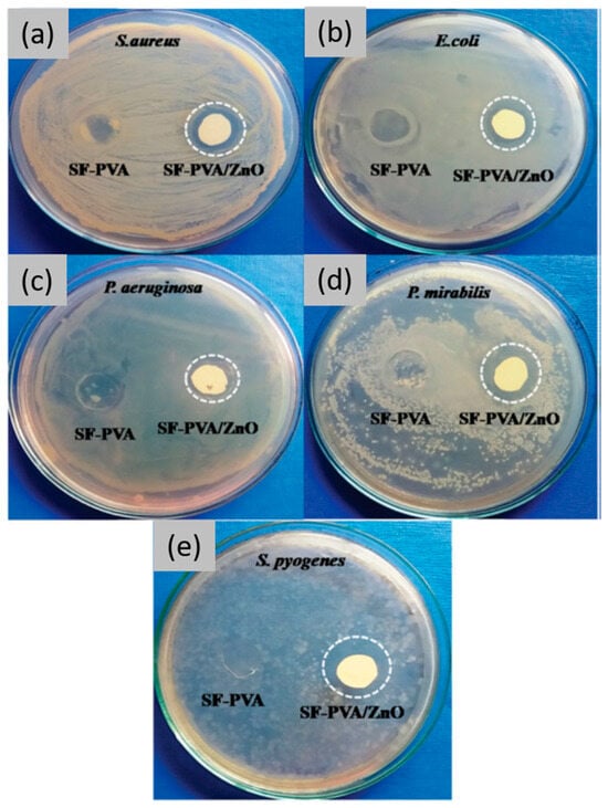 Antimicrobial activity of SF–PVA and SF–PVA/ZnO composite films against (a) S. aureus, (b) E. coli, (c) P. aeruginosa, (d) P. mirabilis, and (e) S. pyogenes microorganisms. Reprinted and adapted with permission from [57]. Copyright Royal Society of Chemistry 2018.
