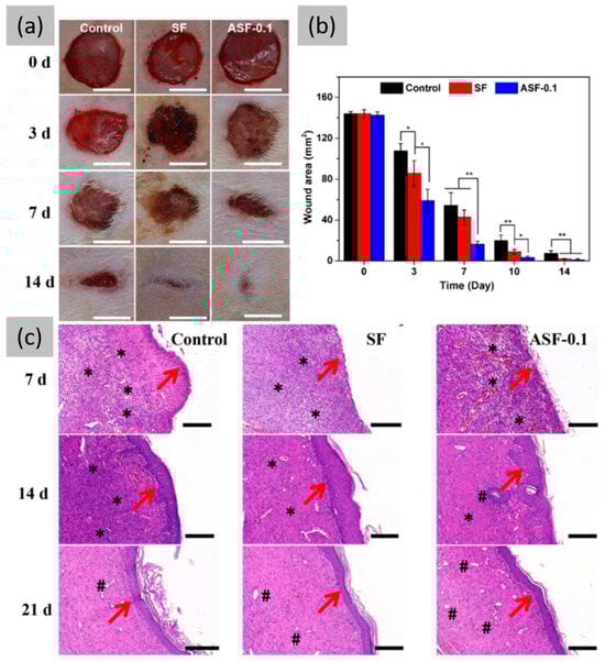 Wound healing ability of different films in a rat full-thickness wound model. (a) Representative photographs of the wound healing process over 2 weeks (scale: 10 mm). (b) Quantification of wound areas at days 0, 3, 7, 10, and 14 after operation. Note: * p < 0.05, ** p < 0.01. (c) Representative HE (hematoxylin and eosin)-stained photographs of the wound tissue regeneration process at 7, 14, and 21 days after surgery (scale: 200 µm). Note: →, new epithelium; *, inflammatory cells; #, hair follicle cells. Reprinted and adapted with permission from [79]. Copyright Elsevier Clearance Center 2023.