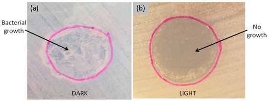 Antimicrobial “patch assay”. KFMB400 film placed upon LB agar inoculated with S. aureus was incubated in the dark (a) or irradiated (b) for 75 min. After film removal, bacteria were grown for 24 h at 37 °C. Reprinted and adapted with permission from [80]. Copyright Clearance Center American Chemical Society 2015.