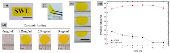 (a) Transparency of curcumin-loaded SF film (scale bar 10 mm), (b) free-standing curcumin-loaded SF film in the dry state, (c) hydrated films follow surface contours (scale bar: 10 mm), (d) SF films can be loaded with a range of curcumin concentrations, (e) inhibition ratio kinetic curves of SF/Gly/GA/Cur composite film against S. aureus and E. coli. Reprinted and adapted with permission from [46].