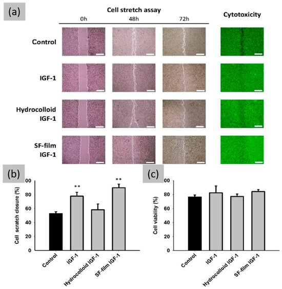 Effects of IGF-1, hydrocolloid IGF-1, and SF film IGF-1 on BALB/3T3 fibroblast scratch closure, cytotoxicity, and viability. (a) Scratch closure and cytotoxicity of BALB/3T3 monolayer in the presence of hyperglycemic medium at different times. Cells were stained with LIVE/DEAD stain and examined under a fluorescence microscope. (b) Quantification of cell scratch closure after different treatments at 48 h in hyperglycemic medium. (c) Cell viability after different treatments at 72 h. Significant differences between the control (black bar) and treatment groups were determined by Dunnett’s multiple comparison post hoc test. ** p < 0.01; n = 3; mean ± SEM. (Scale bars = 500 μm). Reprinted and adapted with permission from [99].