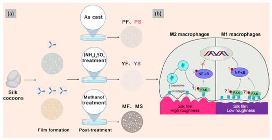 (a) Preparation and screening of SF films with different surface roughnesses and (b) the potential mechanism of roughness on macrophage polarization. Reprinted and adapted with permission from [104]. Copyright Elsevier Clearance Center 2024.