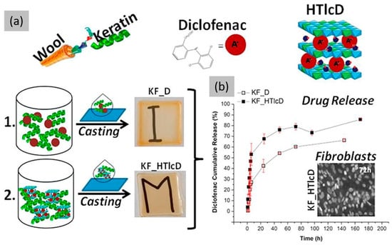 Another approach to address this issue is to formulate drug-loaded films capable of managing inflammation and pain. For instance, our research [109] described the development of transparent and free-standing organic–inorganic hybrid films for drug delivery purposes. Specifically, the researchers created a matrix of Ker extracted from wool filled with ZnAl hydrotalcite (HTlc) nanoparticles that had intercalated diclofenac, a member of the non-steroidal anti-inflammatory (NSAID) group of drugs (Figure 8). Previous studies have also shown that diclofenac-incorporated formulations show antimicrobial activity, to some extent, against various bacterial strains [110,111,112]. The composite films were characterized and evaluated in vitro as drug delivery systems, since the incorporation of the anionic drug into the lamellar structure of the hydrotalcites enabled its protection and controlled release from the polymer matrix.