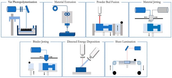 This advanced manufacturing technology, pioneered by Charles Hull in the early 1980s, enables the creation of customized and intricate structures with high precision and accuracy [15]. The technology operates by using computer-aided design (CAD) software to create a virtual model of the structure, which is subsequently converted into a physical object through the use of various 3D printing techniques [16]. The International Standard Organization (ISO) and the American Society for Testing and Materials (ASTM) [17] have established a classification system comprising seven overarching categories to categorize AM methods based on part manufacturing approaches, as outlined in Figure 1. The subsequent sections provide a succinct overview of AM processes.