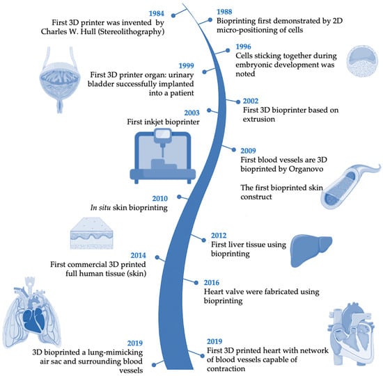 In recent decades, significant advancements have been made in the field of 3D bioprinting (Figure 2) [47,48,49,50]. The evolution of this technology began with the invention of SLA by Charles Hull in 1984, which marked the beginning of 3D bioprinting [48]. Subsequently, in 2002, Landers et al. introduced extrusion-based bioprinting technology, which was later commercialized under the name “3D-Bioplotter” [51,52]. In 2003, Thomas and Boland’s research team adapted a conventional inkjet printer to develop the first inkjet bioprinter capable of printing living cells [51,52]. Later, the engineering of scaffold-free vascular tissue via bioprinting was achieved by Norotte et al. [53]. The subsequent years witnessed the development and introduction of various bioprinted constructs, including an artificial liver in 2012, full human skin in 2014, a heart valve in 2016, and a lung-mimicking air sac with surrounding blood vessels in 2019, among other innovations [47,48,49,50].