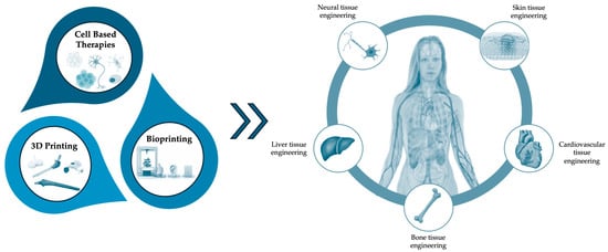 In recent years, two promising approaches have gained attention: namely, three-dimensional (3D) printing and cellular therapies. 3D printing has revolutionized tissue engineering through the manufacture of complex, patient-specific materials whilst providing precise control over the spatial distribution of cells and biomaterials. On the other hand, cellular therapies encompass the use of living cells to replace, repair, or regenerate injured tissues. The integration of 3D printing with cell therapies provides personalised, cell-laden constructs that mimic the complex architecture and function of native tissues. This approach stimulates cell–cell interactions, cell–matrix interactions and the creation of functional tissue-like constructs [5,6].