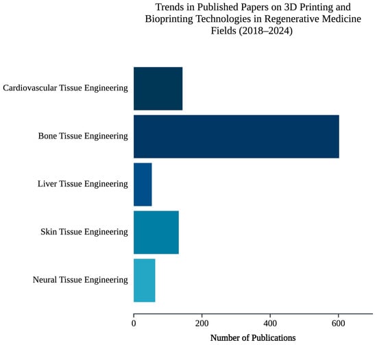 Over recent years, research concerning 3D printing and bioprinting technologies in regenerative medicine has grown significantly. As indicated in Figure 4, the number of publications related to bone regeneration is noticeably higher than the other fields. This prominence can be attributed to the compatibility of bone with 3D printing technologies, which allow precise control of scaffold porosity and the development of patient-specific implants. Furthermore, the high clinical demand for bone regeneration solutions, the limitations of traditional grafting techniques, and advancements in clinical translation, including regulatory approvals of 3D-printed bone supports, have significantly contributed to the extensive research focus in this area [158,159,160].