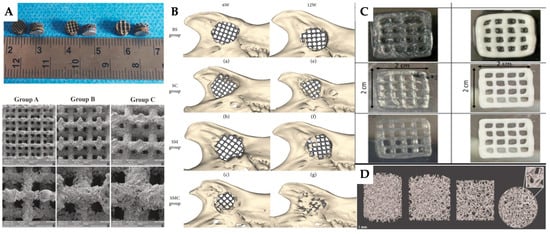 Advances in 3D printing/bioprinting and cell therapies in bone tissue engineering: (A): Ti6Al4V-based porous tantalum (Ta) scaffolds and scanning electron microscopy images (adapted from [197]); (B): Newly formed bone within the scaffold was assessed through ex vivo micro-computed tomography(micro-CT) scans at 6 and 12 weeks (adapted from [198]); (C): Visual representations of 3D-printed samples at different alginate concentrations, alginate alone or alginate with beta-tricalcium phosphate (β-TCP) (adapted with permission from [199], Copyright 2024 Elsevier); (D): Bone scaffolds based on magnesium (Mg2+), strontium (Sr2+) and zinc (Zn2+)-substituted hydroxyapatite, as represented in the CAD model [200]).