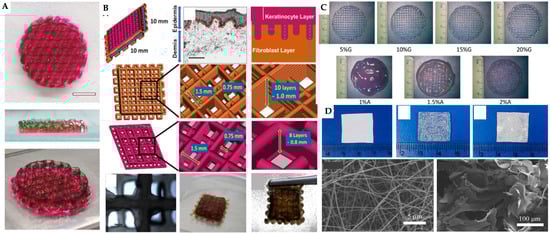 - Song, Y.; Hu, Q.; Liu, S.; Wang, Y.; Zhang, H.; Chen, J.; Yao, G. Electrospinning/3D printing drug-loaded antibacterial polycaprolactone nanofiber/sodium alginate-gelatin hydrogel bilayer scaffold for skin wound repair. Int. J. Biol. Macromol. 2024, 275, 129705. [Google Scholar] [CrossRef]
