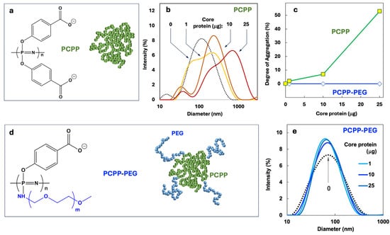 Selection of PCPP-PEG as a polyphosphazene delivery vehicle for preparing VMPNs is made based on the stability of its complexes with HCV core antigen. (a) Chemical structure and schematic presentation of PCPP, (b) DLS profiles of PCPP and its complexes with core protein, (c) degree of aggregation determined by DLS as a function of core protein concentration for PCPP and PCPP-PEG, (d) chemical structure and schematic presentation of PCPP-PEG, and (e) DLS profiles of PCPP-PEG and its complexes with core protein (25 µg E1E2, 50 µg PCPP or PCPP-PEG, PBS, pH 7.4).