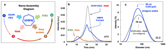 Preparation and characterization of PCPP-PEG-based VMPNs containing R848 and HCV antigens. (a) Schematic diagram of VMPN nano-assembly showing sequential steps of component addition, (b) AF4 profiles showing protein–polymer binding, and (c) DLS profiles of VMPNs contrasted with protein-free polymer (z-average diameters are shown, pdi—polydispersity index).