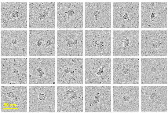 Cryogenic electron microscopy (cryo-EM) is an advanced technique used for visualizing biomacromolecules, such as proteins. It provides images of biomolecules embedded in vitreous, glass-like ice, revealing the real-space architecture of macromolecules and their nanoassemblies in their native environment [63,64,65,66]. Although the visualization of synthetic polymer chains has been challenging due to the low electron optical contrast of the backbone and their inherent flexibility [67,68,69], the technique was proven to be successful for the analysis of their hierarchical structures, such as micellar assemblies [70,71,72,73]. CryoEM images of E1E2 and core protein-loaded VMPNs are shown in Figure 3. The VMPN assemblies can be described as compact spherical nanocomplexes of somewhat irregular shape. The shape, diameter, and size distribution of VMPNs are reminiscent of HCV virions visualized using the same technique [74] and are strikingly different from the single chains of PCPP macromolecules [48]. The overall dimensions of VMPNs seen from the cryoEM images are in line with those determined by DLS (approximately 60–70 nm, Figure 2c) and are only marginally larger than those of HCV virions (approximately 50 nm) [74].