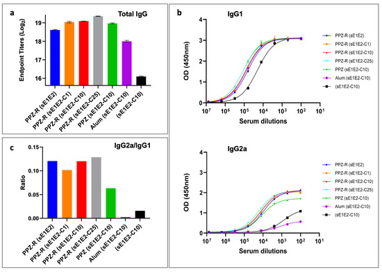 Figure 4a shows that total IgG titers are influenced by both the addition of R848 and core protein, with both leading to an increase in overall titers. Moreover, all of the PPZ formulations elicit higher titers than antigens formulated with Alum or without any adjuvant. The isotype-specific analysis of IgG1 and IgG2a titers shows that, while the IgG1 titers do not vary appreciably between groups (Figure 4b, upper panel), there is a marked disparity in the IgG2a titers (Figure 4b, lower panel), which act as a proxy measure for the strength of the cellular immune response. Among these groups, the differences that achieve statistical significance in an uncorrected pairwise Kruskal–Wallis test are PPZ-R(sE1E2-C10) versus Alum(sE1E2-C10), PPZ-R(sE1E2-C25) versus sE1E2-C10 (p < 0.05), and PPZ-R(sE1E2-C25) vs. Alum(sE1E2-C10) (p < 0.01).