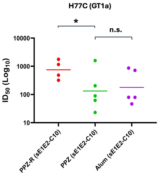 Potency of neutralization of individual mouse sera against H77C (GT1a) comparing PPZ and Alum-based formulations. Individual immunized mice sera were assessed for neutralization activities at day 56 and day 0. Serum dilutions were performed as three-fold dilutions starting at 1:150 for HCVpp neutralization. The experiment was performed in duplicate, and the geometric mean of each group is denoted. p values were calculated using the Kruskal–Wallis analysis of variance with Dunn’s multiple comparison test, and significant p values are shown (* p < 0.05, n.s. p > 0.5).